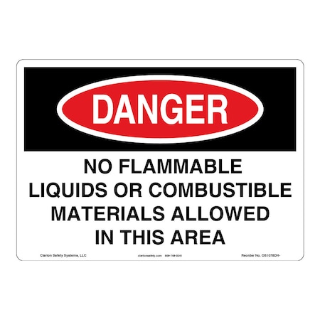 <p><strong>Word Message: </strong><br />NO FLAMMABLE LIQUIDS OR COMBUSTIBLE MATERIALS ALLOWED IN THIS AREA</p> <p><strong>Description: </strong><br />Clarion Safety Systems brings you Danger No Flammable Liquids or Combustible Materials Allowed in This Area safety signs (OS1078DH-) which are produced on premium plastic or aluminum material and are designed to meet your OSHA safety sign needs.<p><strong>Material Information:</strong></p> <ul> <li><strong>Material</strong>: (S2) Outdoor Weather Tuff Plastic</li> <li><strong>Base Materials</strong>: .060" Rigid White Plastic</li> <li><strong>Overlaminate</strong>: 3M .003 Ultra-Clear WeatherTuff UV resistant</li> <li><strong>Mounting Option</strong>: Mounting holes</li> <li><strong>Application</strong>: Indoor/Outdoor</li> <li><strong>MaxTemp</strong> (F): 140</li> <li><strong>MinTemp</strong> (F): 32</li> <li><strong>Chemical Resistance</strong>: Excellent</li> <li><strong>UV Resistance</strong>: Excellent</li> <li><strong>Outdoor durability</strong>: Excellent</li> <li><strong>Storage Stability</strong>: Stable. Optimum storage conditions: 72 F @ 50% relative humidity</li> <li><strong>Expected Life Indoor</strong>: Long term</li> <li><strong>Expected Life Outdoor</strong>: 5 - 10 years (expected outdoor life may vary due to climatic conditions)</li> <li><strong>RoHS</strong>: No</li> <li><strong>CRoHS</strong>: No</li> <li><strong>REACH</strong>: No</li> </ul>