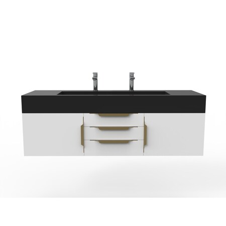 This beautiful, modern, wall-mounted vanity set comes with a base made from high quality birch and plywood and a top made of durable solid surface (a type of man-made stone). It's modern minimalist look is enhanced by its mounting to the wall which gives the appearance that the vanity is floating. Drawers and doors feature soft close hinges and slides to prevent slamming as well as sleek concealed pull handles to enhance the look without sacrificing function. The top features an elegant and modern sink with a basin sloped towards a subtle drain that gives the piece a sleek aesthetic and unparalleled sophistication. This vanity will be a stunning addition to any bathroom renovation.Note: Faucet not included.<br/><br/>Features :<br/><br/>- Base Material: Birch and Plywood<br/>- Top Material: Solid Surface<br/>- Size: 60" L x 19" W x 20" H<br/>- Base Finish: Matte White<br/>- Top Finish: Black<br/>- Handle Color: Gold<br/>- Beautiful modern design fits any bathroom<br/>- Soft close door and drawers<br/>- Faucet Not Included.<br/><br/>Specifications :<br/><br/>- Color/Finish : Matte White Base with Black top and Gold Handles<br/>- Product Dimensions : 59.5" L x 18.75" W x 14.25" H<br/>- Cabinet Dimensions : 18.75" W x 17.25" D x 12.5" H<br/>- Drawer Dimensions : 17.25" W x 12" D x 3" H<br/>- Assembly Required : Yes.