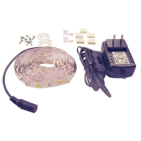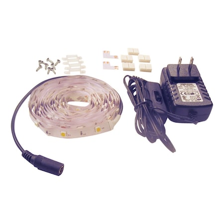 Flexible LED Tape, LED5050TW3M, 3m/118" x 10mm/.41" Indoor, (SMD5050 30pcs/meter Warm White), 5' 12V 2A 24W cULus power supply with rotary switch, 5 cover joiners, 2 L connectors, 24W, 1350Lumen, mounting clips. EASY INSTALL/LOW PROFILE:cut to fit at marked intervals, connect, peel and stick, plug in. HIGHLY FLEXIBLE. CONTINUOUS BRIGHT LIGHT. ENERGY EFFICIENT. COOL TO TOUCH. LASTS UP TO 50,000 hours