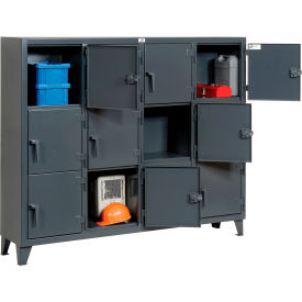 Strong Hold 12-Gauge Extra Heavy Duty 12-Compartment Personnel Lockers, Battleship Construction for Lifetime Durability. Sturdy lockers constructed of heavy-duty, 12-gauge steel to handle your personal and work storage needs. One piece body features an attractive wrap-around design. Safety store personal or company belongings. Each storage units are the perfect choice for those with limited space. Individual compartments measure 18 x 18 x 18 and feature a padlock hasp. Legs allow six inches of sweep space underneath. Flush bottom made of 12-gauge steel. Durable, dark gray electrostatically painted finish. Shipped assembled, ready to use WIDTH INCHES 82 DEPTH INCHES 18 HEIGHT INCHES 68 ASSEMBLY All-Welded COLOR FINISH Gray CONSTRUCTION Steel LOCKER TYPE Steel Lockers-Solid Door OPENINGS 12 PRODUCT FAMILY Lockers STANDARD LOCKERS OR SPECIALTY LOCKERS Specialty Lockers STYLE Multi-Compartment Locker TIER TYPE Triple Tier