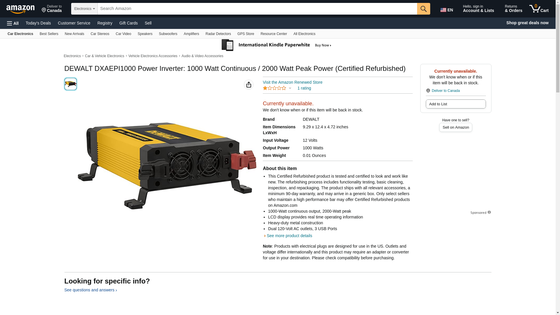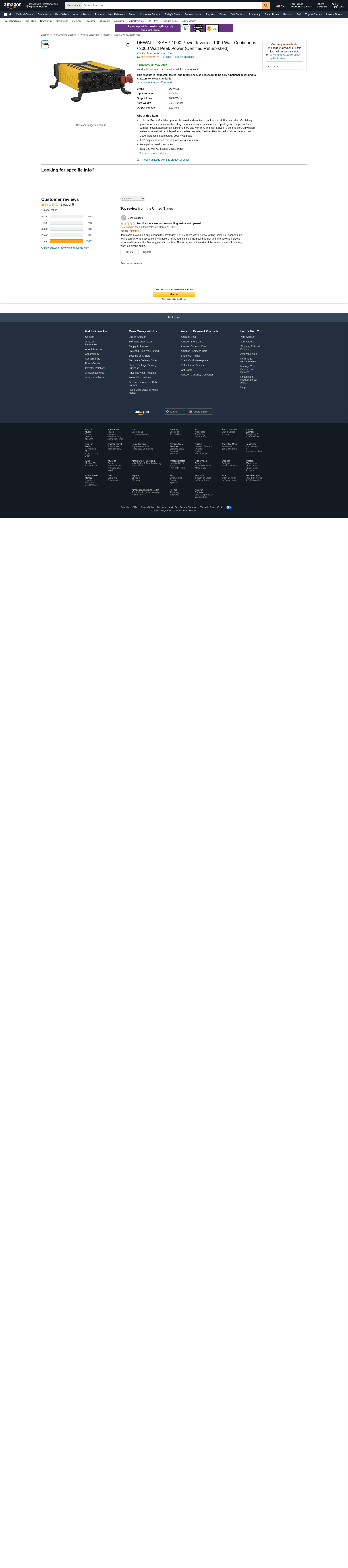 DEWALT DXAEPI1000 Power Inverter: 1000 Watt Continuous / 2000 Watt Peak Power (Certified Refurbished)