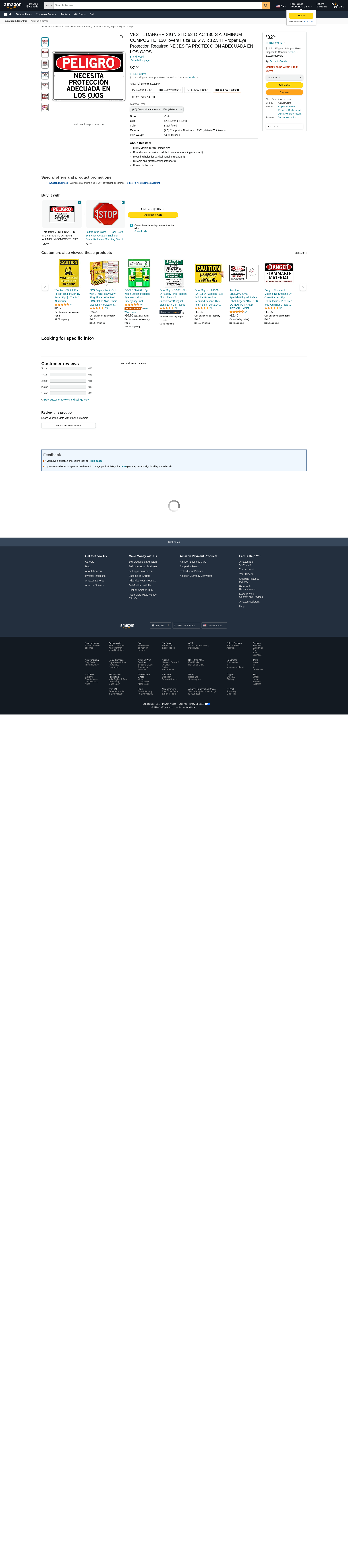 VESTIL DANGER SIGN SI-D-53-D-AC-130-S ALUMINUM COMPOSITE .130" overall size 18.5"W x 12.5"H Proper Eye Protection Required NECESITA PROTECCIÓN ADECUADA EN LOS OJOS