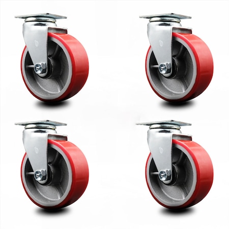 Swivel Top Plate Caster Set – Red 5 Inch by 2 Inch Polyurethane on Cast Iron Wheel – Ball Bearing – 1,800 lbs. Total Capacity – Includes 4 Swivel Casters – Service Caster Brand