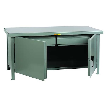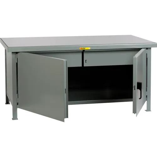 - Steel cabinet workbench with gray powder coat finish for use in industrial and manufacturing plants, classrooms, laboratories, and other work environments