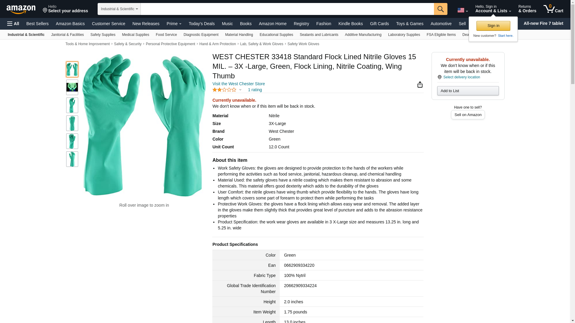 WEST CHESTER 33418 Standard Flock Lined Nitrile Gloves 15 MIL. – 3X -Large, Green, Flock Lining, Nitrile Coating, Wing Thumb