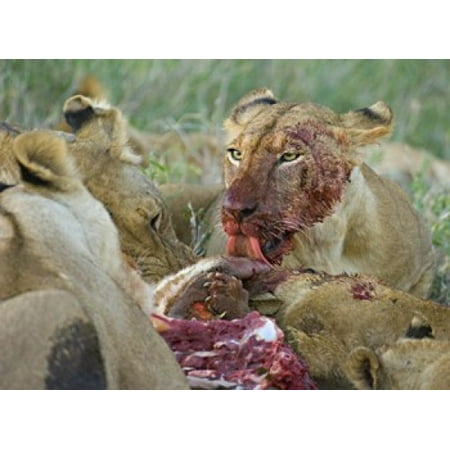 Panoramic Images Stretched Canvas Art - Four lioness eating a kill, Ngorongoro Conservation Area, Arusha Region, Tanzania (Panthera leo) - Medium 24 x 18 inch Wall Art Decor Size.