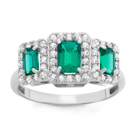 <ul> <li>Gemstone colors: Green, white</li> <li>Gemstone shapes: Emerald, round</li> <li>One prong-set emerald-cut created emerald measures 4 mm x 6 mm</li> </ul>