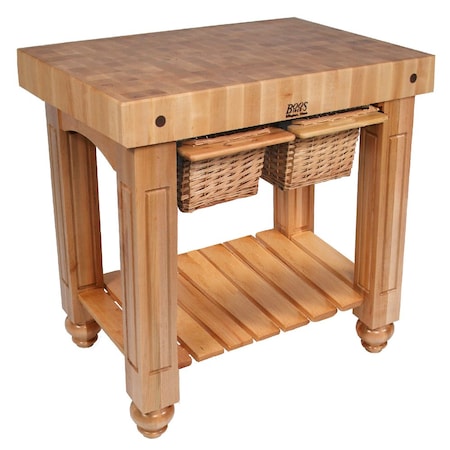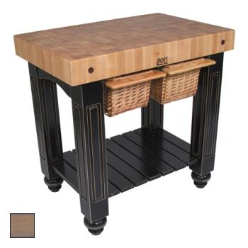 <p>The Gathering Block II is the classic John Boos butcher block, with an end-grain maple top finished in a protective food-safe varnish. Professional and home cooks alike treasure the heavy-duty end-grain butcher block because it absorbs heavy knife blocks without dulling the edge of the blade. <p>This country-style Gathering Block II is where adults can converge for conversations, cocktails or food preparation, or kids can roll homemade biscuits and cookies with mom. The all-maple butcher block features two wicker storage baskets that are accessible from both sides, and a slatted appliance shelf. <p>John Boos is America's oldest manufacturer of premium quality kitchen equipment, and has been producing fine butcher blocks, cutting boards and kitchen islands since 1887. John Boos butcher blocks and kitchen islands have been used by generations of professional chefs in restaurants, foodservice institutions and even in the White House. <p><UL><LI>36 x 24 end-grain maple butcher block</li><LI>Hard rock maple frame with wicker basket drawer</li><LI>Slatted appliance shelf</li><LI>Stands 36 high</LI></UL><p><strong>Manufacturer:</strong>John Boos<br /><strong>Manufacturer Style:</strong>American Heritage Collection<br /><strong>Model:</strong>CU-GB3624-UG<br /><strong>Color:</strong>Gray Stain<br /><strong>Material:</strong>Maple<br /><strong>Length:</strong>36 inches<br /><strong>Width:</strong>24 inches<br /><strong>Depth:</strong>4 inches<br /><strong>Height:</strong>36<br /><strong>Surface Area:</strong>4<br /><strong>Warranty:</strong>1 year limited<br />