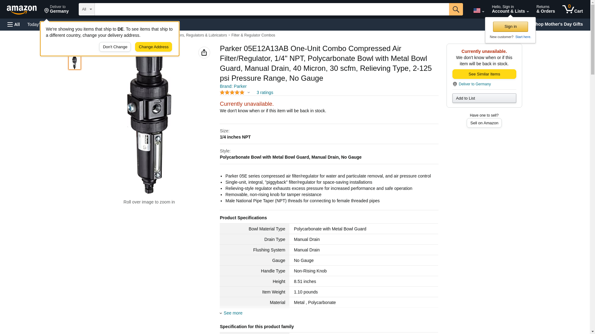 - Parker 05E series compressed air filter/regulator for water and particulate removal, and air pressure control