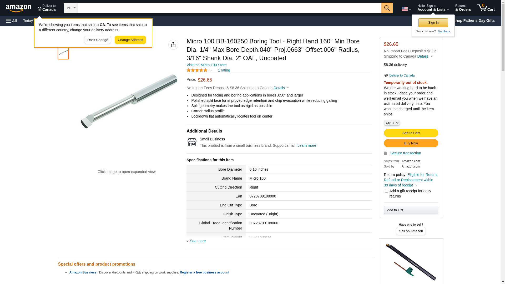 Micro 100 BB-160250 Boring Tool - Right Hand, 176" Min Bore Dia, 1/4" Max Bore Depth, 040" Proj, 0663" Offset, 006" Radius, 3/16" Shank Dia, 2" OAL, Uncoated