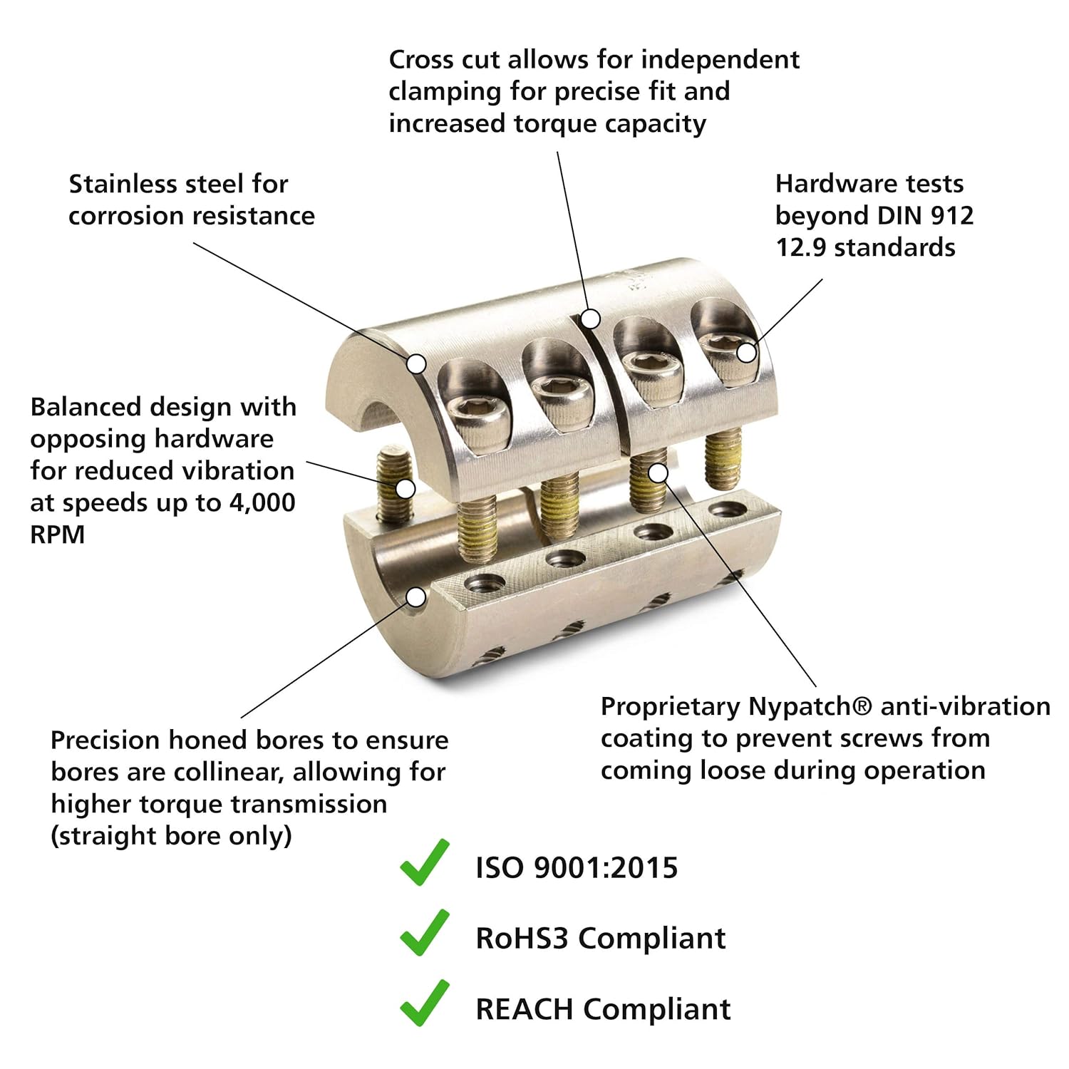 - Precision honed bores on straight bore couplings for superior fit and torque transmission. Does not mar the shaft. Two-piece styles have opposing hardware for a balanced design.