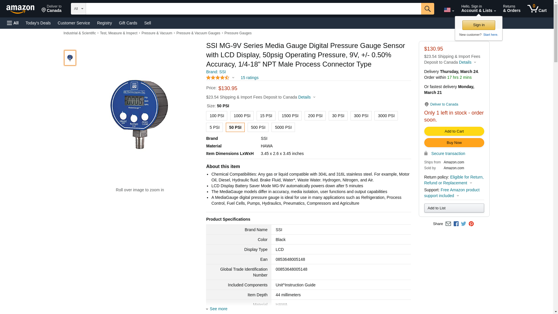 SSI MG-9V Series Media Gauge Digital Pressure Gauge Sensor with LCD Display, 50psig Operating Pressure, 9V, +/- 0.50% Accuracy, 1/4-18" NPT Male Process Connector Type