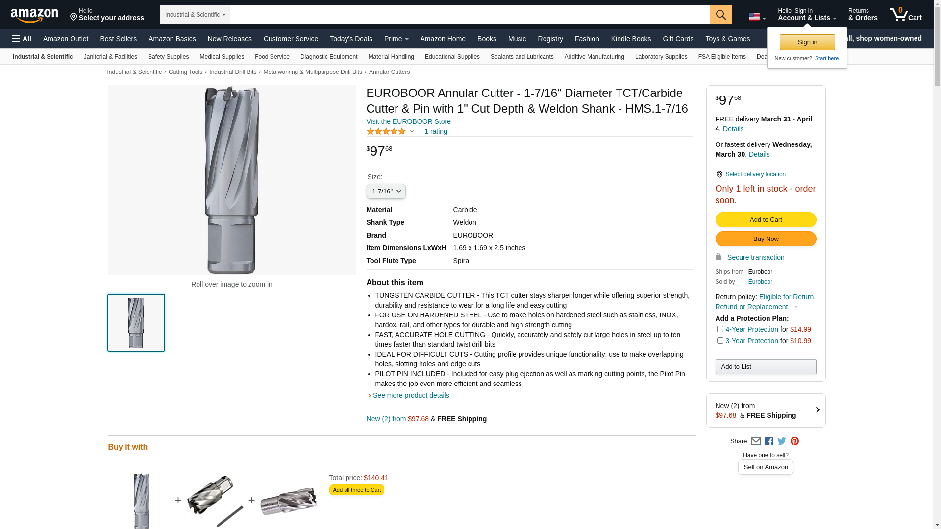 EUROBOOR Annular Cutter - 1-7/16" Diameter TCT/Carbide Cutter & Pin with 1" Cut Depth & Weldon Shank - HMS.1-7/16