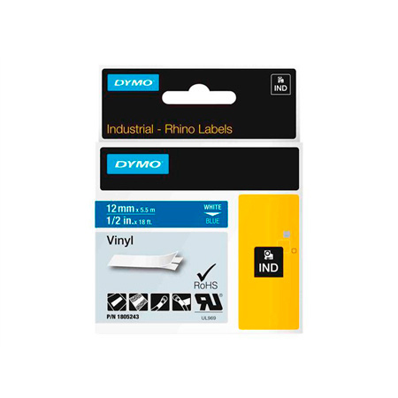 Dymo Label Tape, Vinyl, 0.5In X 18Ft L, White On Blue - 1805243