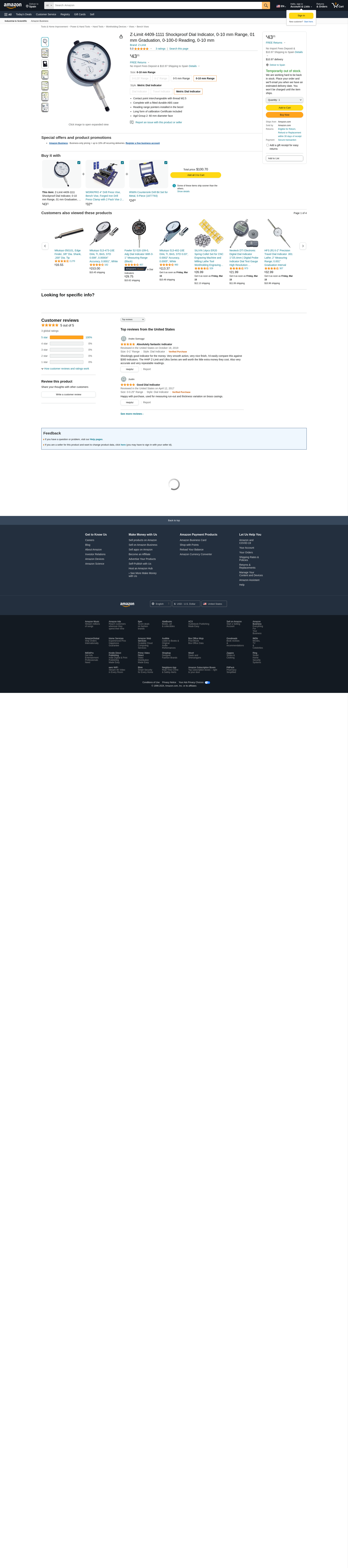 Z-Limit 4409-1111 Shockproof Dial Indicator, 0-10 mm Range, 01 mm Graduation, 0-100-0 Reading, 0-10 mm