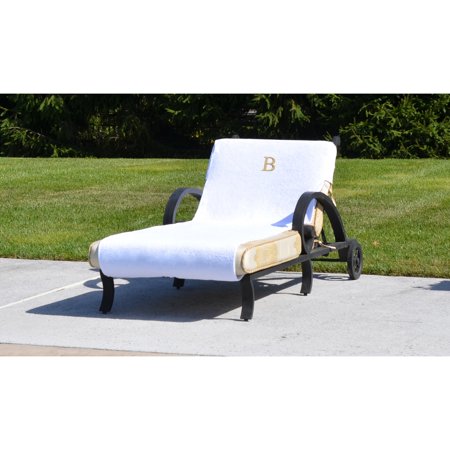 <ul> <li>Lounge chair towel cover</li> <li>100-percent genuine Turkish cotton</li> <li>White Turkish terry cotton chaise lounge cover is monogrammed with an embroidered gold block initial of your choice</li> </ul>