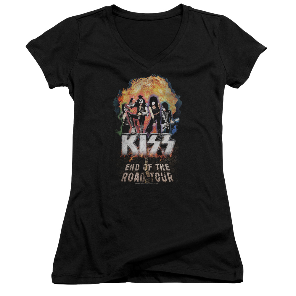 Trevco KISS257-JV-3 Kiss & Boom Print Juniors Sheer Cap Sleeve V-Neck T-Shirt, Black - Large