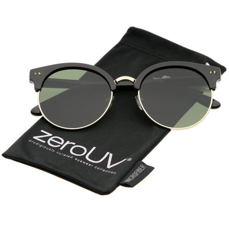 Glamorous round oversized half rimmed sunglasses that feature a round neutral-hued flat lenses for less curvature of the frame. A metal nose bridge and trim along the bottom adds a luxurious feel to this style. Versatile enough to wear from season to season, these round sunglasses are the perfect ac
