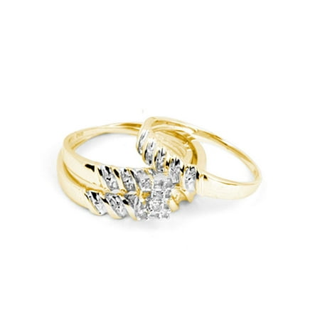 14kt Yellow Gold His & Hers Round Diamond Cluster Matching Bridal Wedding Ring Band Set 1/10 Cttw. Combined diamond weight of 1/10 carats total weight represents a range of 0.09 - 0.11 cts. t.w.