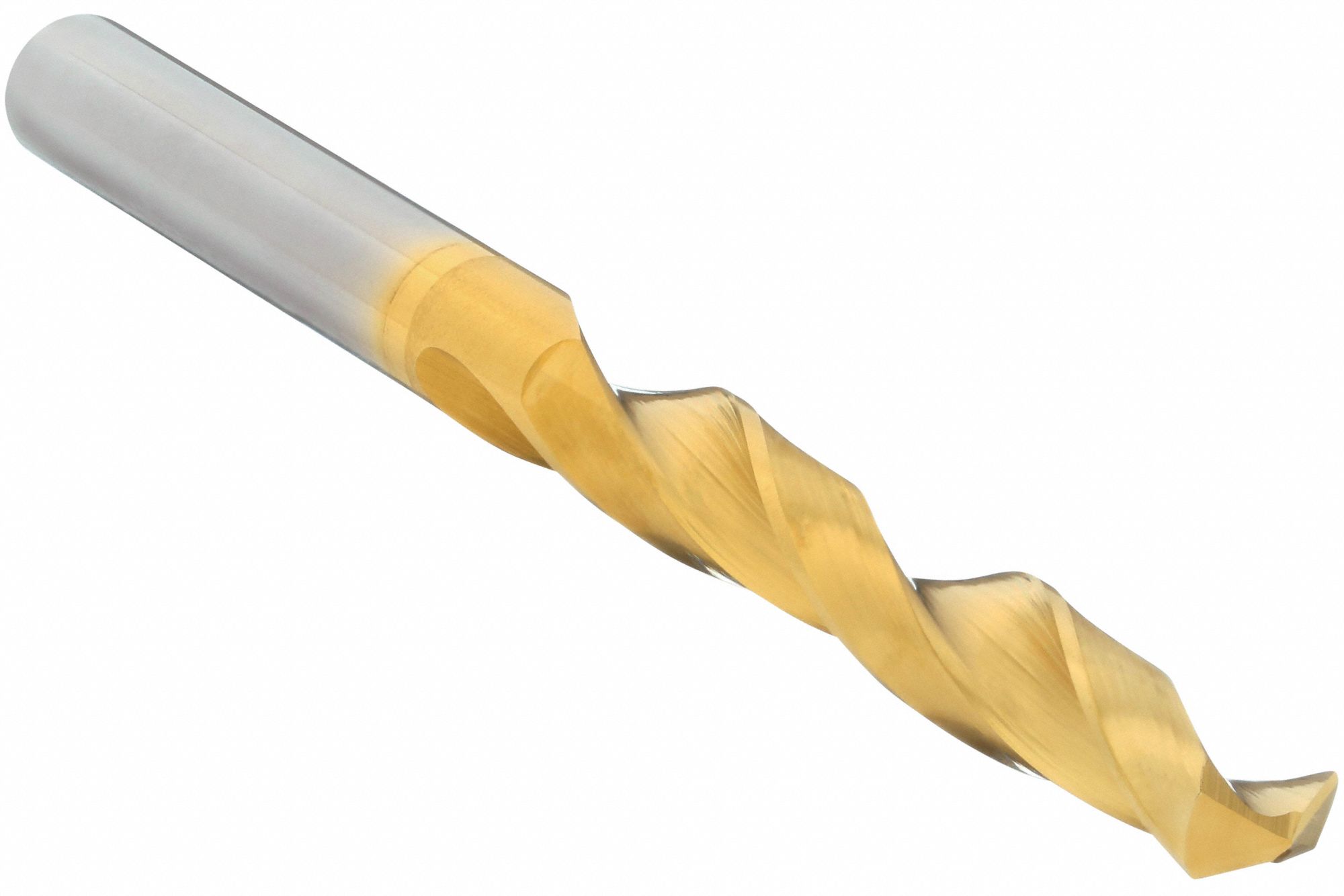 'Jobber Drill Bit, Fractional Inch, Drill Bit Size 3/16 In., Decimal Equivalent 0.1875, Drill Bit Point Angle 118 Degrees , Drill Bit Material Solid Carbide, Drill Bit Finish TiN, Coolant Through No, Overall Length 2-3/4 In., Cutting Direction Right Hand, Shank Dia. 0.1856 In., Flute Length 1-5/8 In., Point Type Split Point'