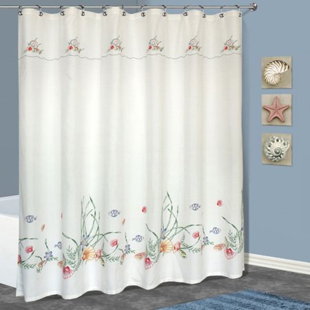 <p>Seashell Shower Curtain</p> <p>Beautiful shower curtains by United Curtain Company. A wide array of options and textures ensure there is something for everyone and a shower curtain for every décor.</p> <ul> <li>Weave: Printed</li> <li>Lovely seashell underwater scene on white body</li> <li>12 standard ring slits for easy hanging</li> </ul> <p>Care Instructions: Machine wash cold, tumble dry low, cool iron, never bleach.</p> <br /> <br /> <b>Dimensions:</b> Length: 72in - Thickness: 0.5in - Width: 70in <end></end>