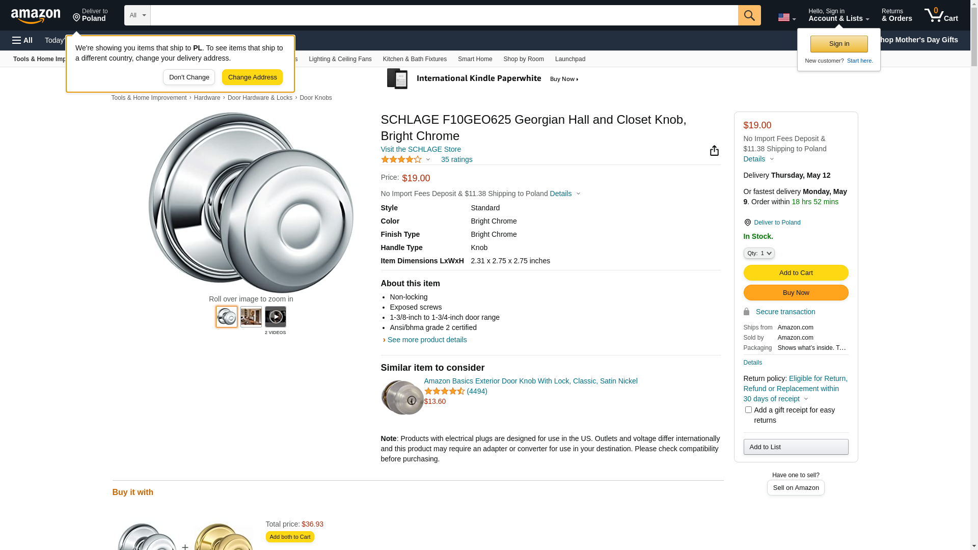 SCHLAGE F10GEO625 Georgian Hall and Closet Knob, Bright Chrome