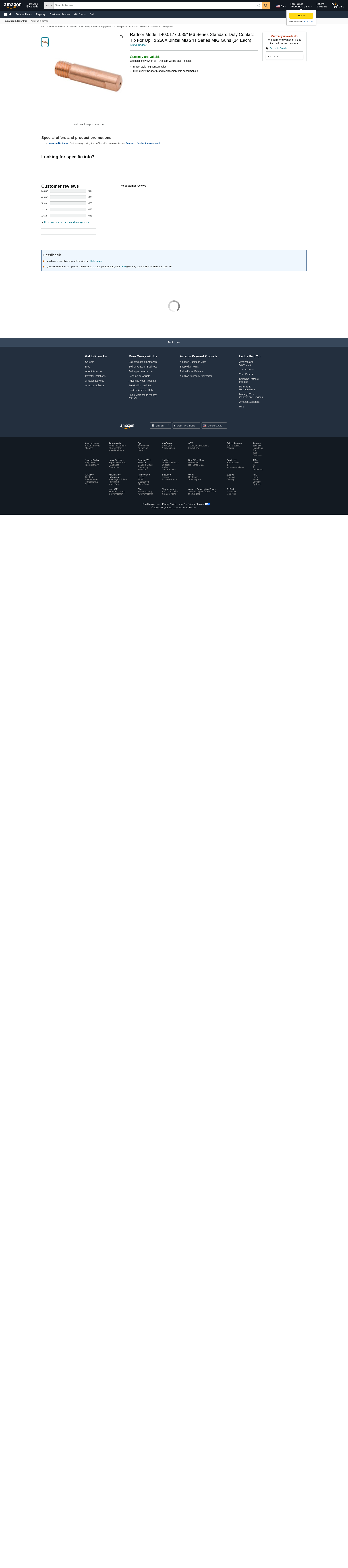 Radnor Model 140.0177 .035" M6 Series Standard Duty Contact Tip For Up To 250A Binzel MB 24T Series MIG Guns (36 Each)