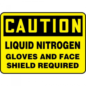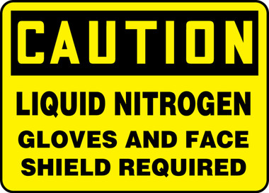 OSHA Safety Signs - CAUTION: Liquid Nitrogen - Gloves And Face Shield Required, 10" x 14". Two-ply, poly-carbonate plastic with industrial-strength backing. Resists fading, chemicals, corrosion, abrasions, cracking, and chipping. Non-glare reverse and subsurface print encapsulated by permanently bonded embossed poly surface. <br>Rounded corners and 1/4" mounting holes on most sizes. Service temperature range: Poly-carbonate at -60 to 260 F; backing -40 to 176 F.<br><br>Accu-Shield is the highest performance sign material, with an extended 15-year outdoor durability guarantee. The non-glare polycarbonate plastic is specially formulated to resist color change, chemicals, corrosion, vandalism, and abrasions - and will continue to look good for years while maintaining its superior strength. The two-ply, heavy-duty construction provides a rugged yet stylish appearance.<br><br>The legend and message are reverse-printed with UV resistant inks on the underside of the clear polycarbonate. This sub-surface image is sealed with further protection on the backside by a permanently bonded, laminated poly sheet. A composite sign, .189" thick, will not crack, chip, fade, or become brittle under extreme environments. Use indoors and outdoors. with service temperature range for poly-carbonate at -60 degrees to 260 degrees F. and under layer surface -40 degrees to 176 degrees F.