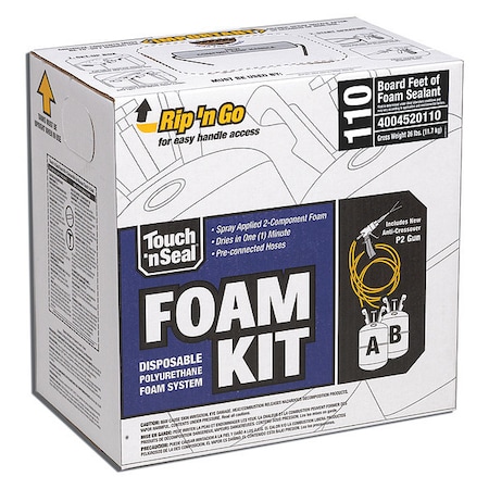 - <b>Price For:</b> Each <b>Coverage</b>: 110 Board ft. <b>Application</b>: Multipurpose <b>Substrates</b>: Wood, Concrete, Polystyrene, Gypsum Board, Fiberboard, Masonry, Metal <b>Expansion Ratio</b>: 6-8:1 <b>Container Type</b>: Two Cylinders <b>Number of Components</b>: 2 <b>Full Cure</b>: 1 hr. <b>Specific Gravity</b>: 1.23 <b>Sealant Application</b>: Air Sealing <b>Begins to Harden</b>: 45 sec. <b>Size</b>: 15.64 lb. <b>Item</b>: Insulating Spray Foam Sealant Kit