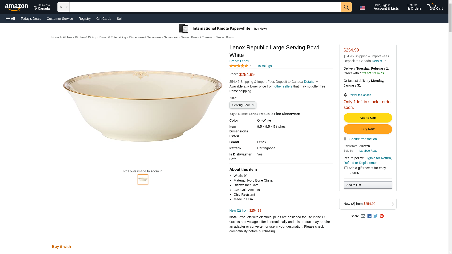 Lenox Republic Serving Bowl. Crafted of Lenox ivory fine china. Accented with 24 karat gold. Dishwasher-safe. Diamete...
