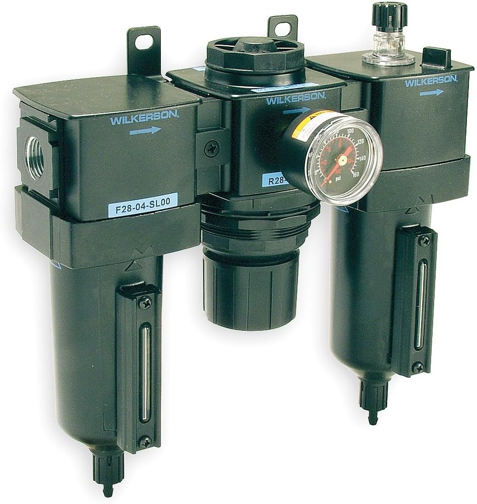 | Feature | Price For: Each Drain Type: Manual Filter Rating: 5 micron Item: Filter/Regulator/Lubricator Adjustment Range: 0 to 125 psi Adjustment Knob: Non Rising Gauge Port Size: 1/4" NPT Max. Flow: 95 cfm Bowl Material: Metal with Sight Glass Bowl Size: 6.1 oz. Max. Pressure: 250 psi Pipe Size: 3/8" NPT Overall Width: 9.32" Overall Height: 9.36" Number of Pieces: 3 |
