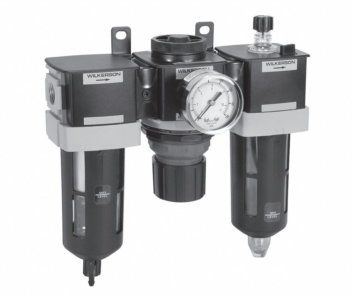 - Price For: Each Drain Type: Manual Filter Rating: 5 micron Item: Filter/Regulator/Lubricator Adjustment Range: 0 to 125 psi Adjustment Knob: Non Rising Gauge Port Size: 1/4" NPT Max. Flow: 95 cfm Bowl Material: Metal with Sight Glass Bowl Size: 6.1 oz. Max. Pressure: 250 psi Pipe Size: 3/8" NPT Overall Width: 9.32" Overall Height: 9.36" Number of Pieces: 3