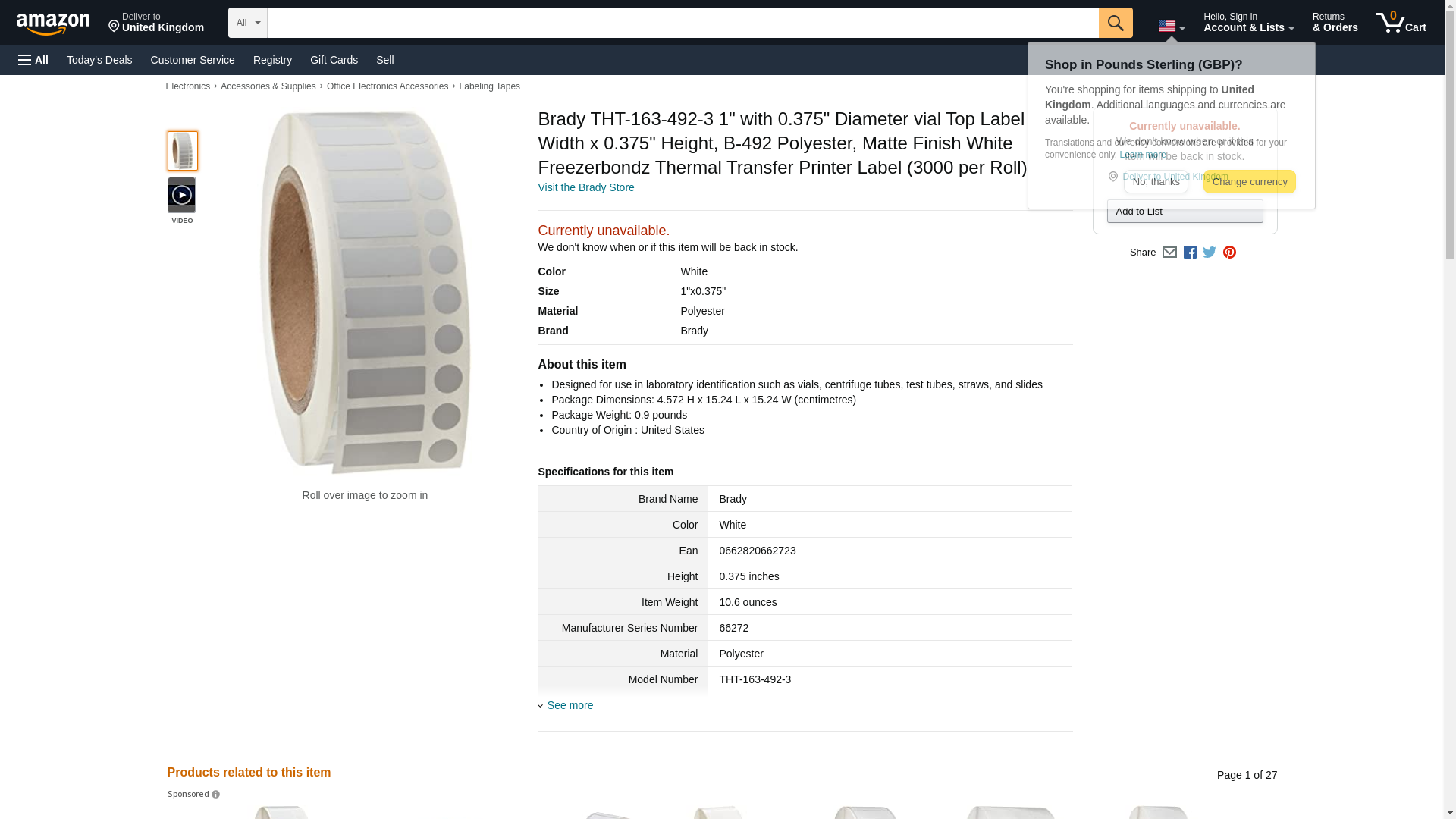 Brady - THT-163-492-3 - Size: 1.000 with 0.375 Diameter vial top label W x 0.375 H (25.400 mm with 9.530 mm Diameter vial top label W x 9.530 mm H), Printable Area: 1.000 W x 0.375 H with 0.375 Diameter vial top label (25.400 mm W x 9.530 mm H with