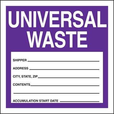 'Hazardous Waste Label, Material Paper, Legend Shipper_______Address_______City,State,Zip_______Contents_______Accumulation Start Date_______, Height 6 In., Width 6 In., Legend Color Purple, Background Color White, Header Universal Waste, Language English, Legend Style Text, Write on Surface Yes, Self-Adhesive Yes, Shape Square, Package Quantity 250'