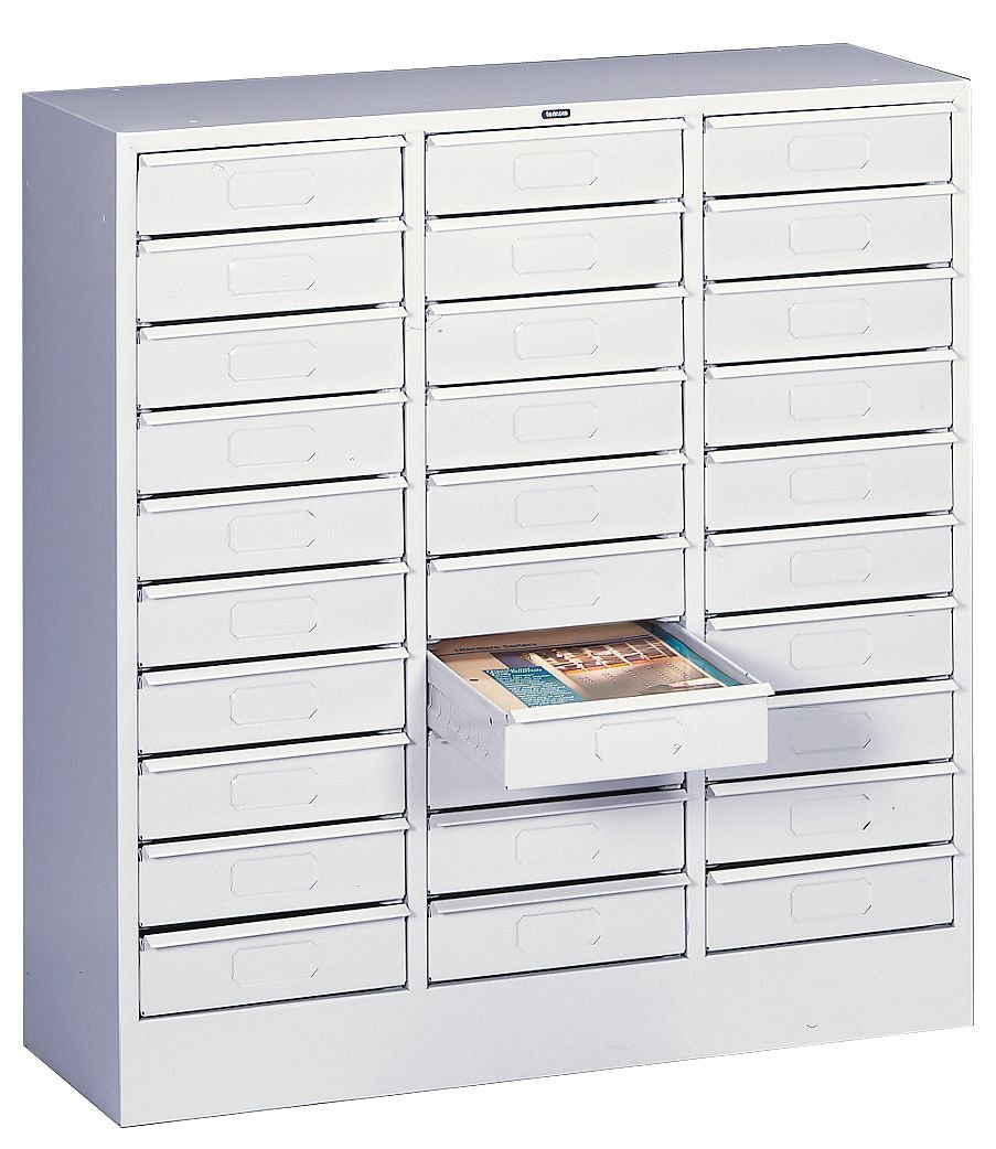 Technical Specification for Horizontal Literature Organizer Type Legal, Drawers Width 30-7/8 Depth 14-1/2 Height 33 Color: Light Gray Construction: Welded Steel and Fully Assembled; Finish: Powder Coat; Number of Drawers or Bins: 30. Green Certification or Other Recognition: SCS Indoor Advantage Certified. Compliance and Restrictions: Green Product - This item has been designated by the manufacturer as an environmentally preferable product (EPP) because this item is SCS Indoor Advantage Certified.