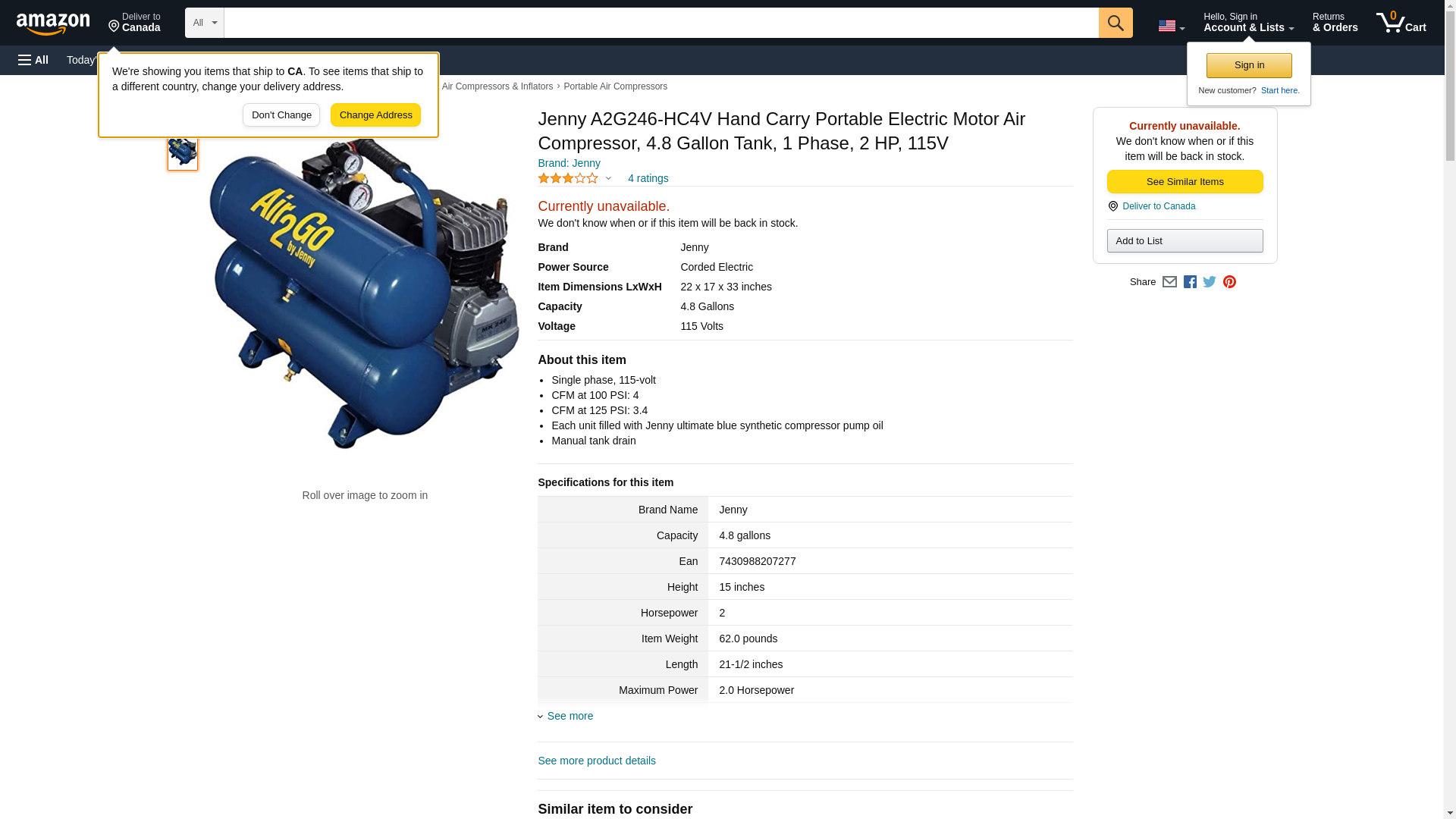 Jenny A2G246-HC4V Hand Carry Portable Electric Motor Air Compressor, 4.8 Gallon Tank, 1 Phase, 2 HP, 115V