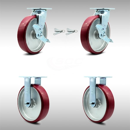 Stainless Steel Polyurethane on Aluminum Swivel Top Plate Caster Set 4 w/8" x 2" Maroon Wheels-Includes 2 Swivel w/Brakes and Bolt on Swivel Locks & 2 Rigid-5000lbs Total Capacity-Service Caster Brand