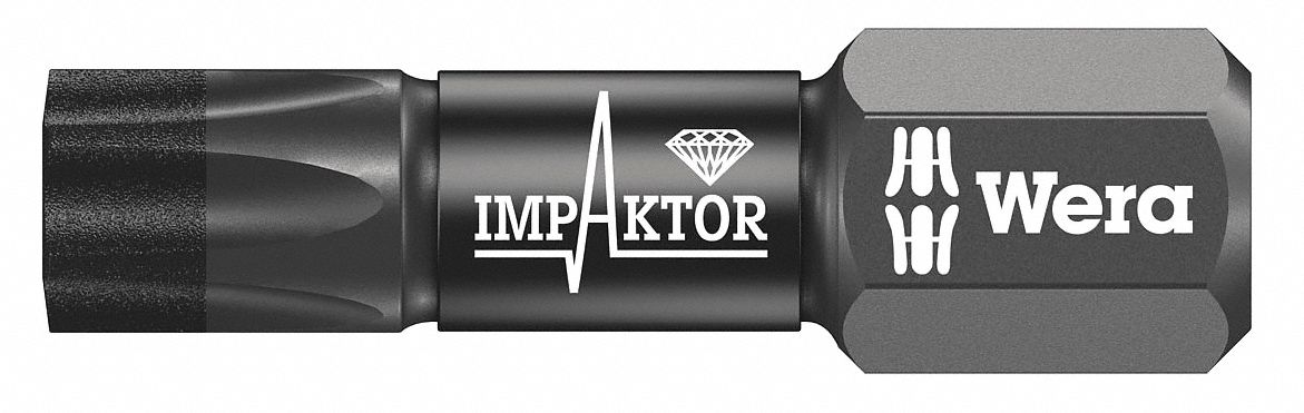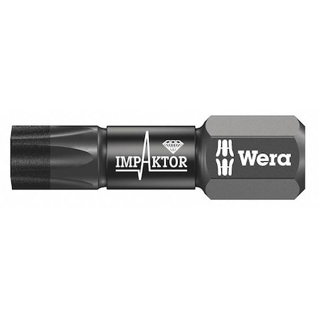 Wera Impaktor 967/1 Torx bits 25mm long with 1/4in hexagon drive , suitable for DIN 3126-F 6.3, ISO 1173 bit holders. The Impaktor technology ensures an above-average service life even under extreme conditions thanks to a best-possible utilisation of the material properties and optimally designed geometry, particularly suitable for use with conventional impact drivers, the rough diamond coating reduces the danger of any slipping out of the screw head due to the enhanced frictional resistance.TX30 x 25mmBox 10 867/1 Impaktor Insert Bit Torx TX30 x 25mm (Box 10)