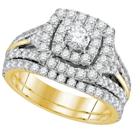 <p><span style="font-size:16px;"><b><u>Description</u></b><br /></span></p> <p><span style="font-size: 14px;">14kt Yellow Gold Womens Round Diamond Certified Double Halo Bridal Wedding Engagement Ring Band Set 1-7/8 Cttw</span></p> <br /> <p><span style="font-size:16px"><u><b>Gemstone Details</b></u></span></p> <p><span style="font-size:14px">1 & 7/8 Carats total weight --- 1/3 carat center solitaire<br /><br />All diamonds are natural and conflict-free in origin<br /><br /></span></p> <ul type="square"> <b>Round Center Diamond</b> <br /> <li>1/3 ct.t.w.</li> <li>SI3 clarity</li> <li>G-H color</li> <li>4-prong setting</li> </ul> <br /> <ul> <b>Round Diamond</b> <br /> <li>1 & 1/2 ct.t.w.</li> <li>I1-I2 clarity</li> <li>H-I color</li> <li>Pave setting</li> </ul> <br /> <p><span style="font-size:16px"><u><b>Specifications</b></u><br /></span></p> <p><span style="font-size:14px">14kt Yellow Gold<br />5.66 grams (approximately)<br />Ring size selectable</span></p> <p><span style="font-size:11px">Combined diamond weight of 1 & 7/8 carats total weight represents a range of 1.83 - 1.94 cts. t.w.</span></p>