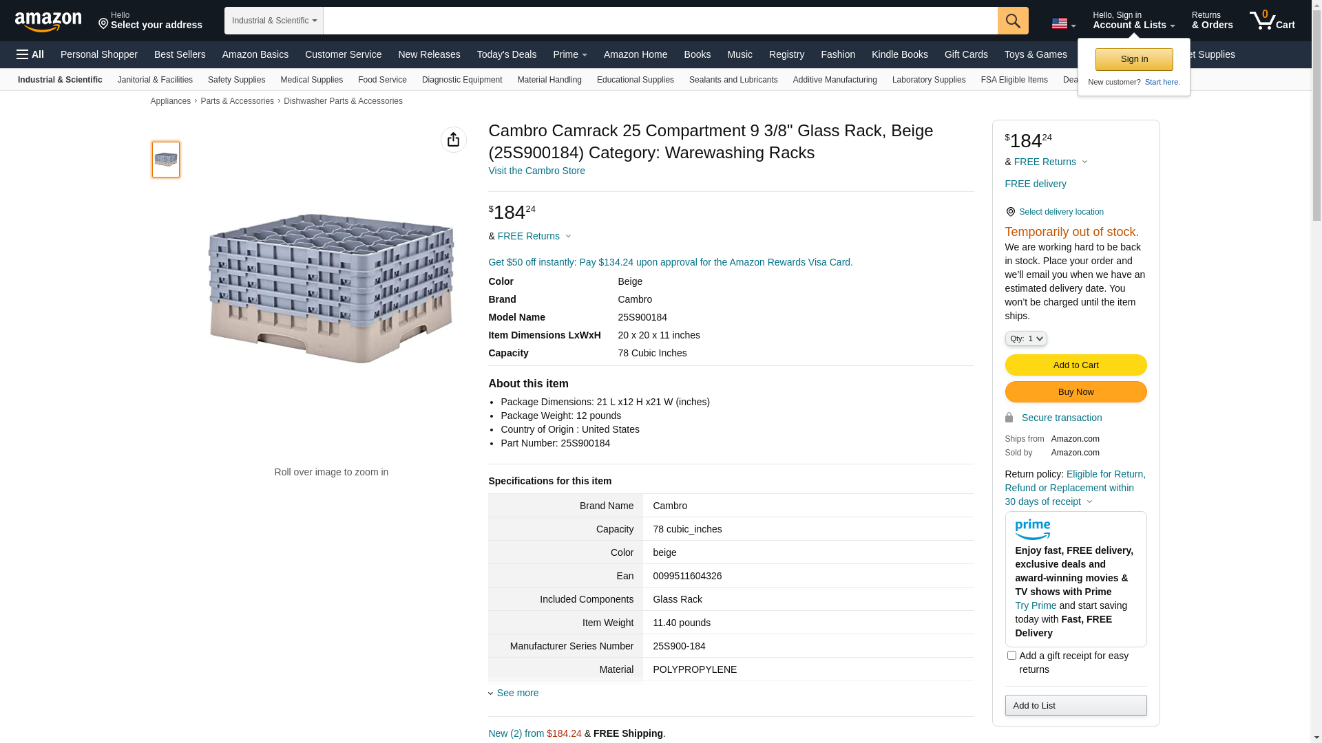 Cambro Camrack 25 Compartment 9 3/8" Glass Rack, Beige (25S900184) Category: Warewashing Racks