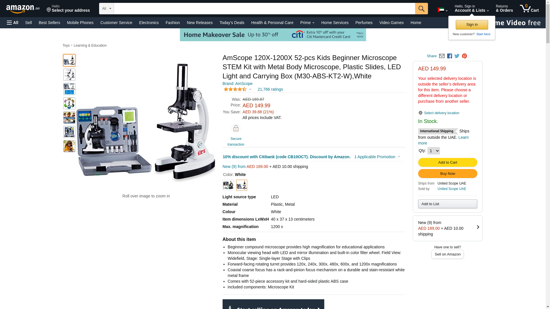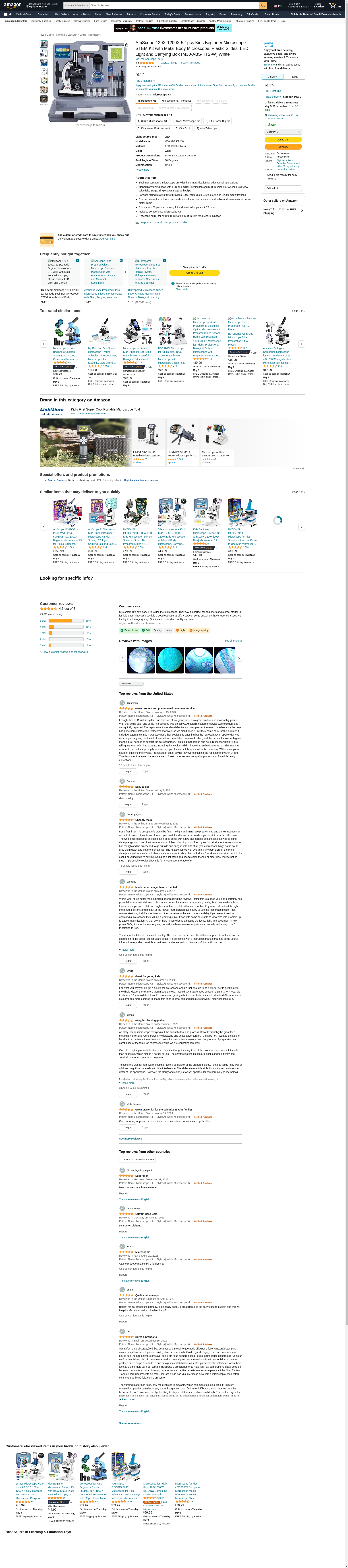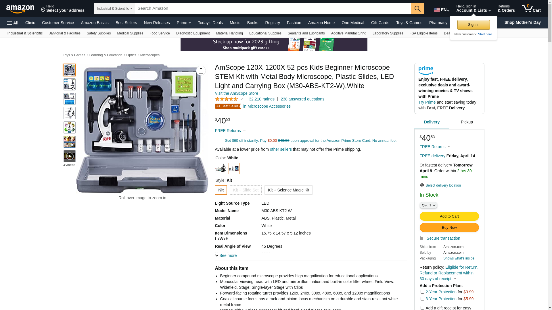 AmScope 120X-1200X 52-pcs Kids Beginner Microscope STEM Kit with Metal Body Microscope, Plastic Slides, LED Light and Carrying Box (M30-ABS-KT2-W),White