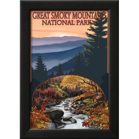 <ul> <li>Title: Great Smoky Mountains - Waterfall, c.2009</li> <li>Artist: Lantern Press</li> <li>Product Type: Framed Art Print</li> <li>Framed in SOHO Black</li> <li>Arrives ready-to-hang for fast, simple installation</li> <li>Framed Size: 12x17 in.</li> <li>Handcrafted in the USA</li> </ul>