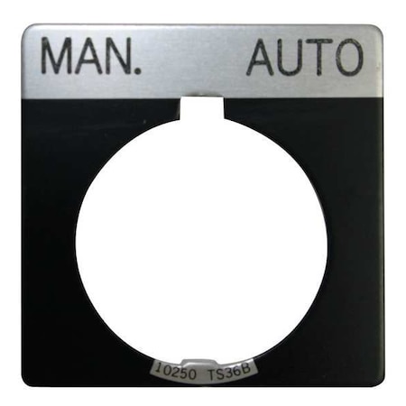 The EATON legend plate is a square plate for 30.5mm selector switches and roto-push operators.<br /><br /> Item: Legend Plate<br /> Shape: Square<br /> Legend: Man-Auto<br /> For Use With: 30.5mm Selector Switch and Roto-Push Operators<br /> Legend/Background Color: Black<br /> Material: Aluminum<br /> Height: 1.75"<br /> Width: 1.75"<br /> Diameter: 30mm<br />