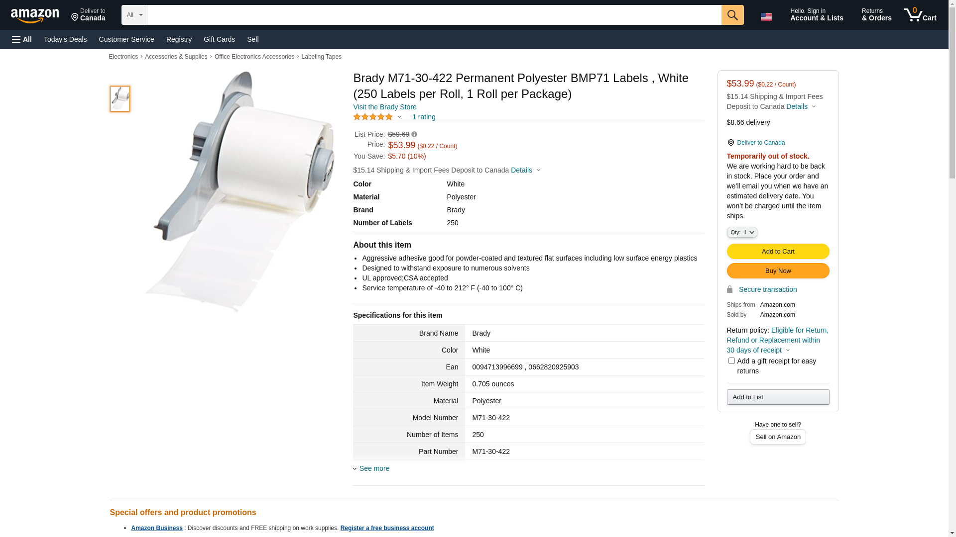 Brady M71-30-422 Permanent Polyester BMP71 Labels , White (250 Labels per Roll, 1 Roll per Package)