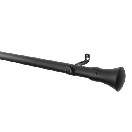 <ul> <li>Adjustable Width: This Curtain Rod extends from 48 to 86 inches wide. Versatile telescoping design makes it easy to fit drapery in a variety of window sizes.</li> <li>This is a simple yet bold finial at 3.25"W X 2.25"H. The round knob design in aaron black finish creates a bold statement and is an impressive accent to any room.</li> <li>The rod is 1 1/8 inch diameter made out of 100% steel. This is an extra durable rod, more than capable of handling heavier black out fabrics.</li> <li>The rich matte black finish provides a strong yet understated look that complements your decor and is perfect for a bedroom, living room, dining room, office, or kitchen.</li> <li>Thanks to an adjustable bracket, this curtain rod will project 3.75 in. to 4.5 in. out from the wall. Additional center support bracket will be included for sizes greater than 48-in. This creates stability and you can count on a balanced weight distribution and appearance. All mounting hardware and instructions are provided for an easy and quick installation.</li> </ul>