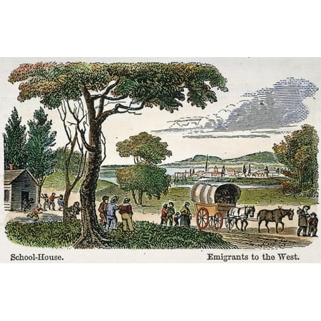 Stretched Canvas Art - Emigrants To West, C1850. /Nemigrants To The American West Passing A Rural Schoolhouse. Colored Engraving, C1850. - Medium 18 x 24 inch Wall Art Decor Size.