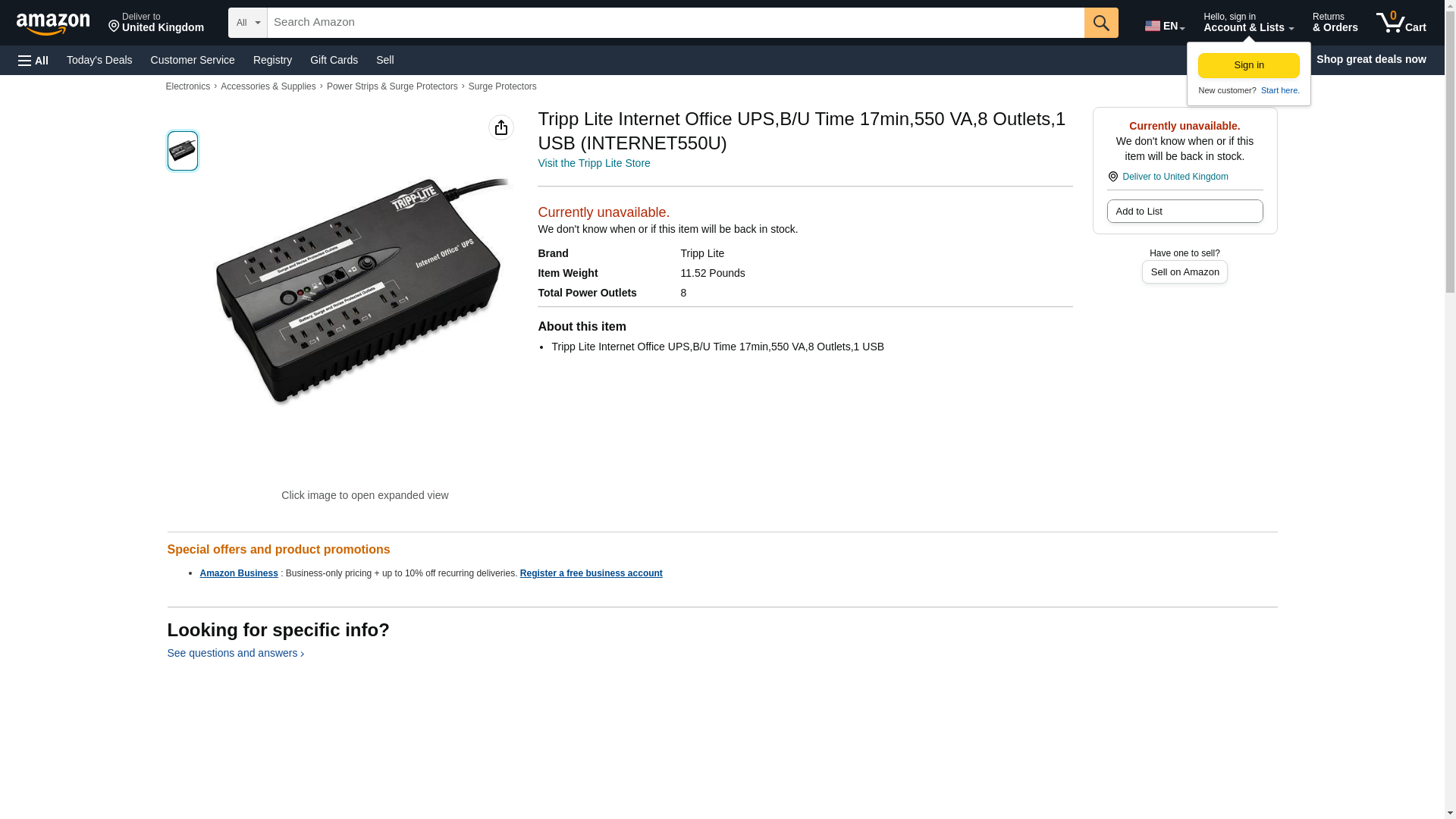 - Tripp Lite Internet Office UPS,B/U Time 17min,550 VA,8 Outlets,1 USB