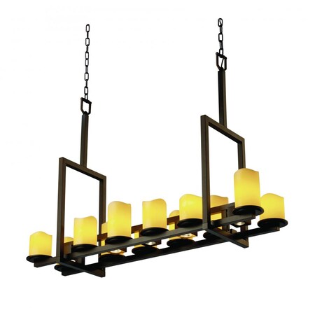 Metal Finish:Dark Bronze, Shade Shape:Cylinder w/ Flat Rim, Faux Candle Shade Color:Amber, Light Bulb:(12)60w B10 Cand F+(5)40w R14 Med F Incand Dakota 12-up and 5-downlight tall bridge chandelier The rich golden glow of candles is captured in the contemporary CandleAria Collection. These fixtures come with candle-like shades that add considerable light, warmth, and charm to any room. Supplemental mounting support required independent of J-box. Includes downlight switch on the chandelier.