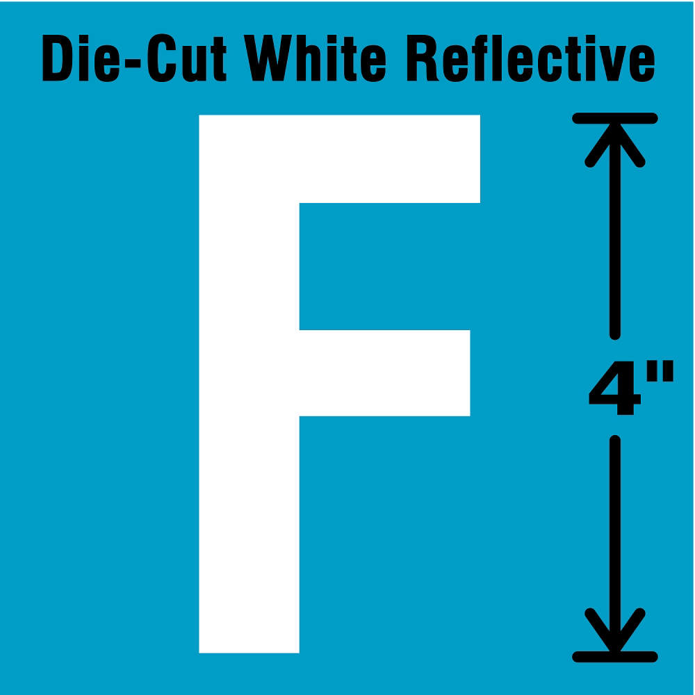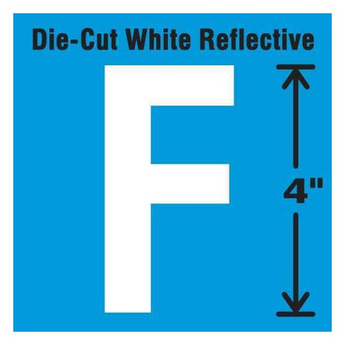 - <b>Price For:</b> Each <b>Material</b>: vinyl <b>Color</b>: Reflective White <b>Item</b>: Reflective Letter Label <b>Die Cut</b>: Yes <b>Indoor/Outdoor Usage</b>: Indoor/Outdoor <b>Character Type</b>: Letters <b>Overall Height</b>: 4" <b>Character Width</b>: 2-1/2" <b>Character Height</b>: 4" <b>Character</b>: F <b>Overall Width</b>: 2-1/2" <b>Country of Origin (subject to change)</b>: United States