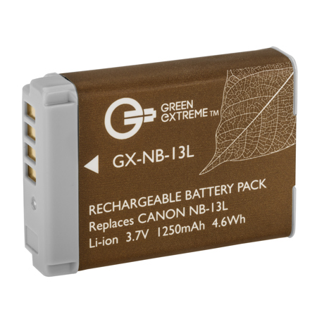 <p>Green Extreme Batteries encourage conservation through renewable energy cells to maximize their use and to contribute in a modest way to energy responsibility. </p><p>The Green Extreme NB-13L is the perfect recharge and go power source compatible with all cameras using the Canon NB-13L. Designed to meet or exceed original manufacturers' specifications for compatibility and performance.Even our packaging is recycled material - green! </p><p>Available for many popular models to power up the most energy demanding cameras and devices. </p><p><i>Compatible Cameras</i></p><p>Canon PowerShot </p><p><b>G5 X </b></p><p><b>G7 X </b></p><p><b>G7 X Mark II </b></p><p><b>G9 X </b></p><p><b>G9 X Mark II </b></p><p><b>SX720 </b></p><p><b>SX730</b></p>
